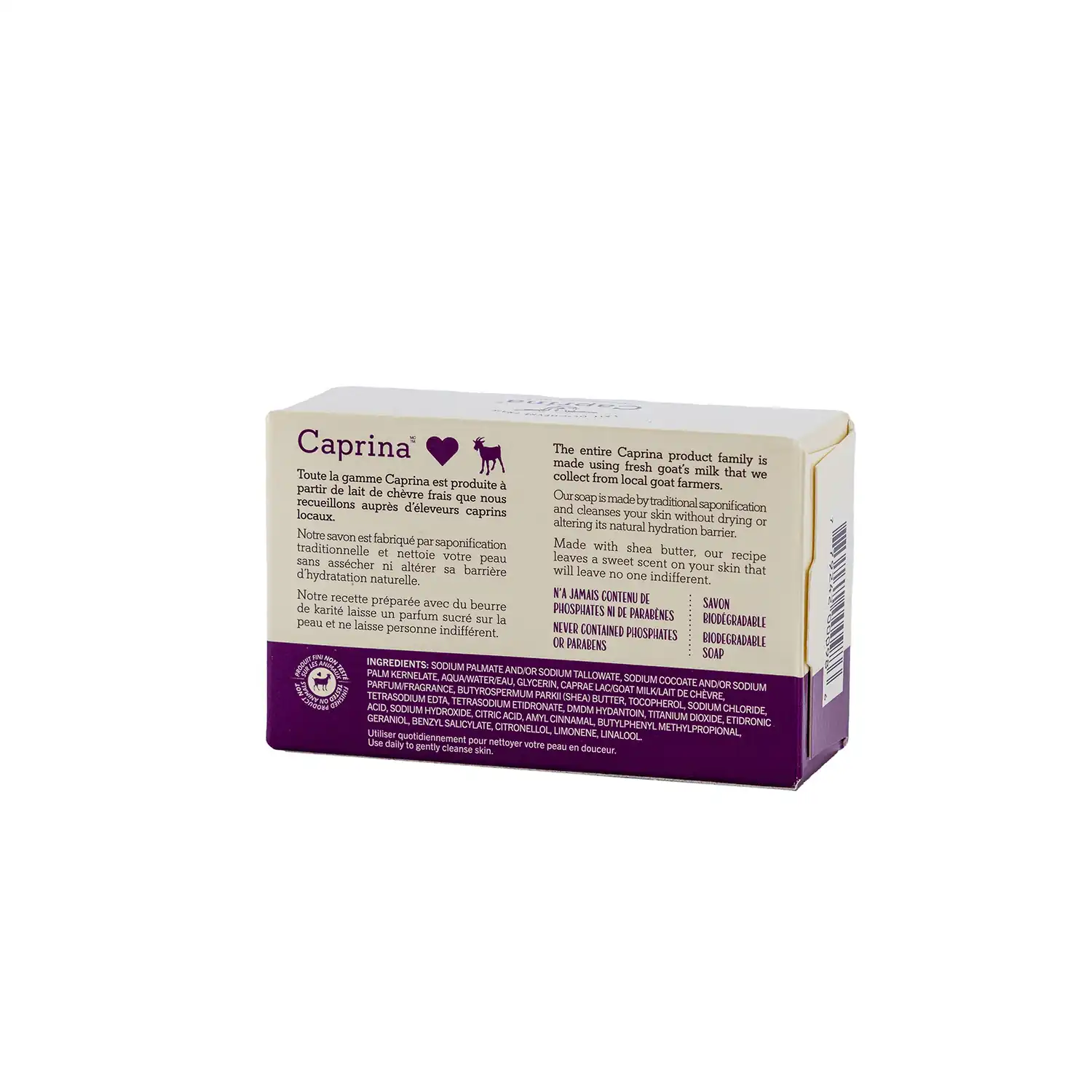 Sodium Palmate and/or Sodium Tallowate, Sodium Cocoate and/or Sodium Palm Kernelate, Aqua/Water/Eau, Caprae Lac/Goat’s Milk/Lait De Chèvre, Glycerin, Palm Kernel Acid, Parfum/Fragrance, Butyrospermum Parkii (Shea) Butter, Tocopherol, Sodium Chloride, Tetrasodium EDTA, DMDM Hydantoin, Titanium Dioxide, Etidronic Acid, Sodium Hydroxide, Amyl Cinnamal, Benzyl Salicylate, Citronellol, Geraniol, Limonene, Linalool