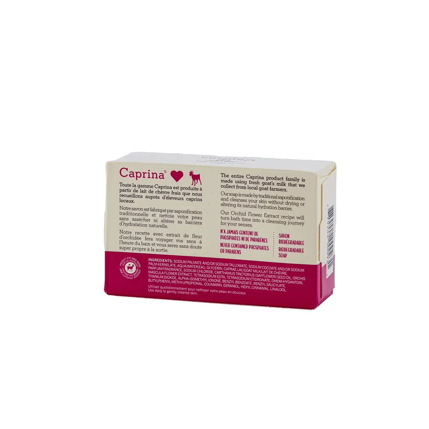 Sodium Palmate and/or Sodium Tallowate, Sodium Cocoate and/or Sodium Palm Kernelate, Aqua/Water/Eau, Caprae Lac/Goat’s Milk/Lait de Chèvre, Glycerin, Palm Kernel Acid, Sodium Chloride, DMDM Hydantoin, Titanium Dioxide, Tetrasodium EDTA, Etidronic Acid