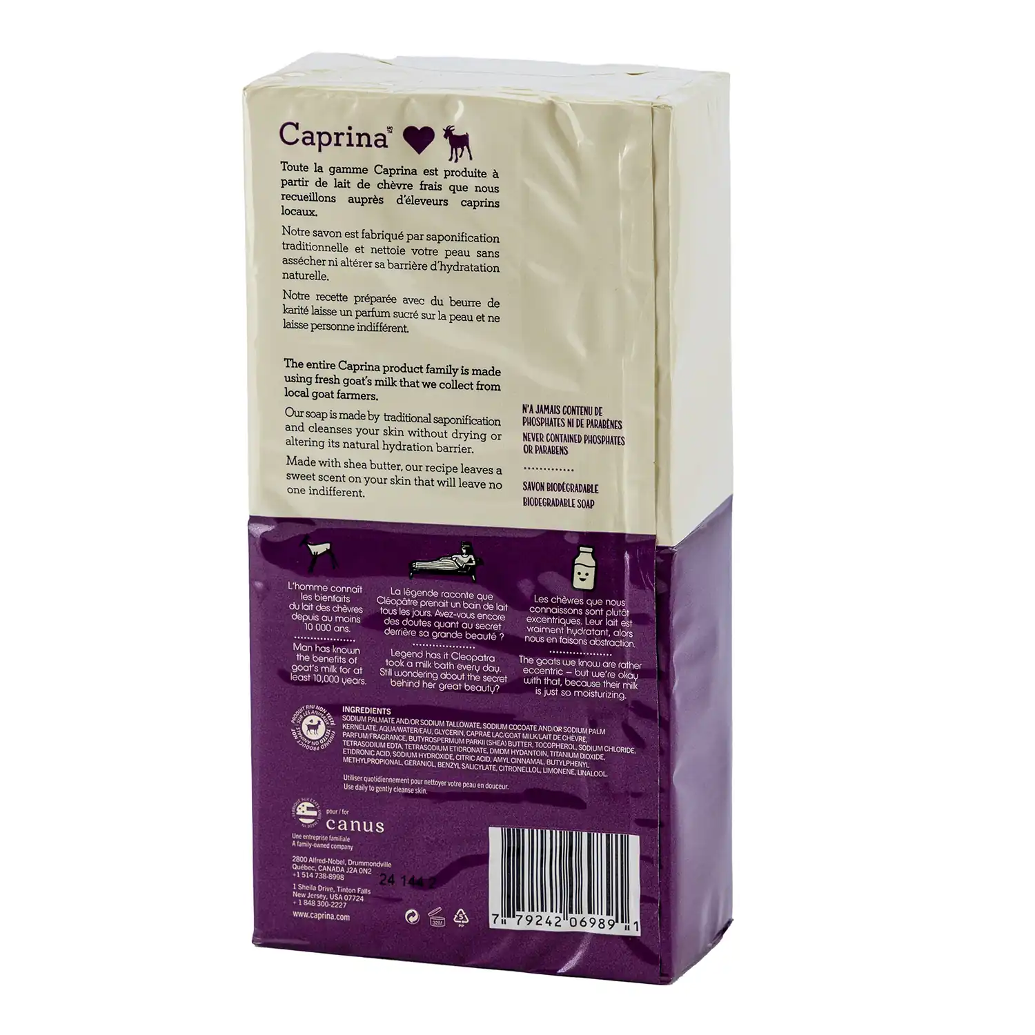 Sodium Palmate and/or Sodium Tallowate, Sodium Cocoate and/or Sodium Palm Kernelate, Aqua/Water/Eau, Caprae Lac/Goat’s Milk/Lait De Chèvre, Glycerin, Palm Kernel Acid, Parfum/Fragrance, Butyrospermum Parkii (Shea) Butter, Tocopherol, Sodium Chloride, Tetrasodium EDTA, DMDM Hydantoin, Titanium Dioxide, Etidronic Acid, Sodium Hydroxide, Amyl Cinnamal, Benzyl Salicylate, Citronellol, Geraniol, Limonene, Linalool
