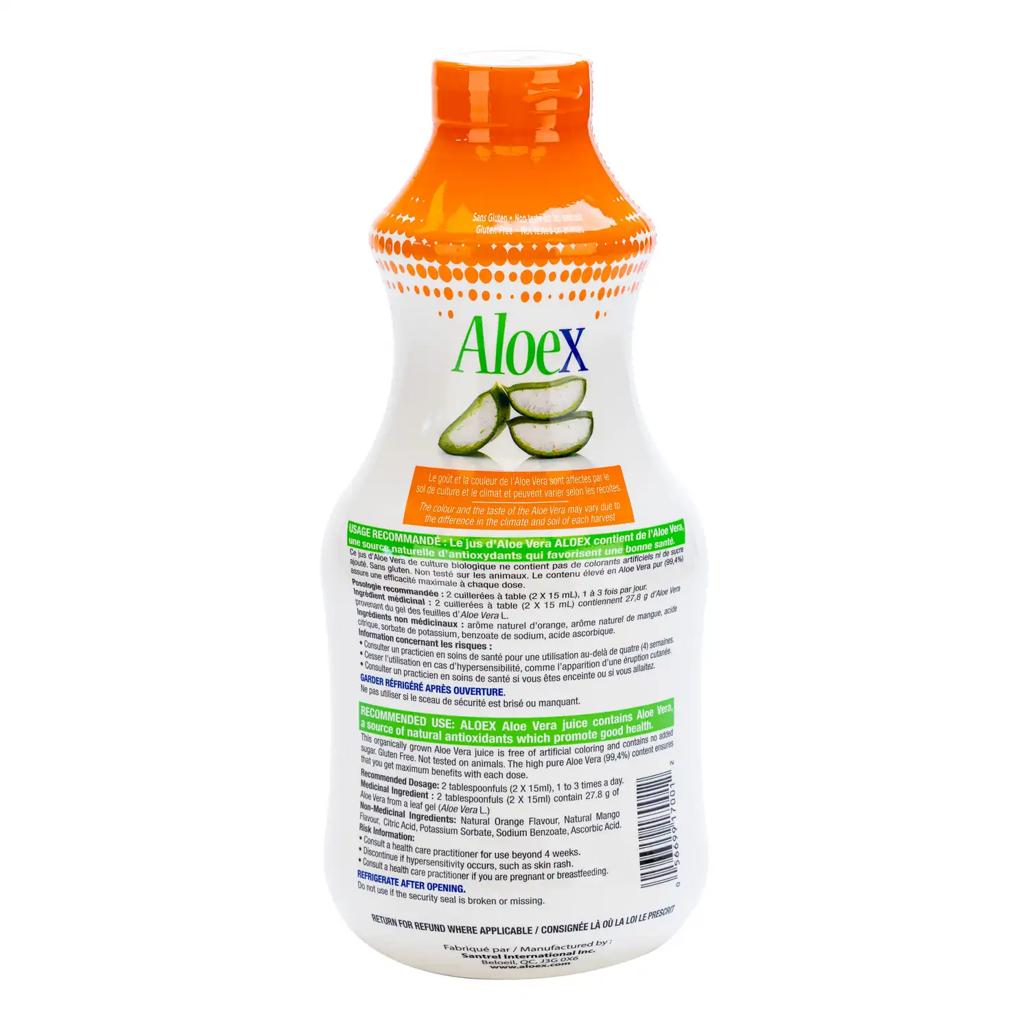 Medicinal ingredients: 2 tablespoons (2 x 15 mL) contain 27.8 g of aloe vera from the gel of Aloe vera L leaves.